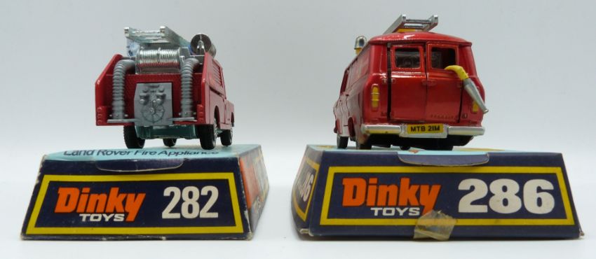 Two Dinky Toys diecast model fire engines Ford Transit Fire Appliance 286 and Land Rover Fire Appliance 282, both in original bubble packed boxes.