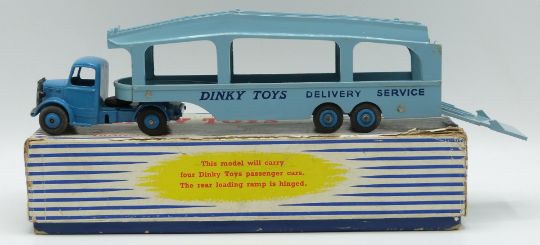 Dinky Toys diecast model Pullmore Car Transporter with blue cab and hubs and pale blue trailer, 982, in original box.
