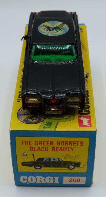 Corgi Toys diecast model The Green Hornet 'Black Beauty' crime fighting car, 268, with black body, green interior, driver, Green Hornet figure, transfer on roof, spun hubs, plastic missiles and spinners and secret instructions, in original box with display stand