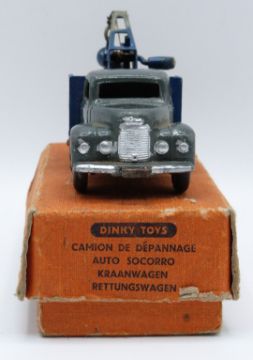 Dinky Toys diecast model Breakdown Lorry with grey body, blue cab and crane and red hubs, 25x, in original box.