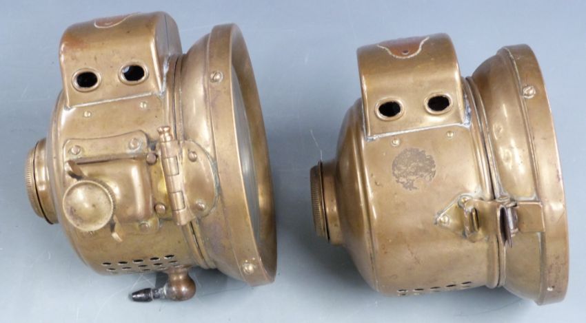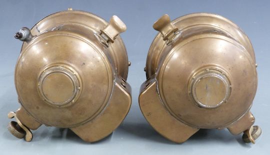 Pair of H & B No. 301 veteran car, motorcycle or similar acetylene headlamps by Howes and Burley, diameter 18.5cm