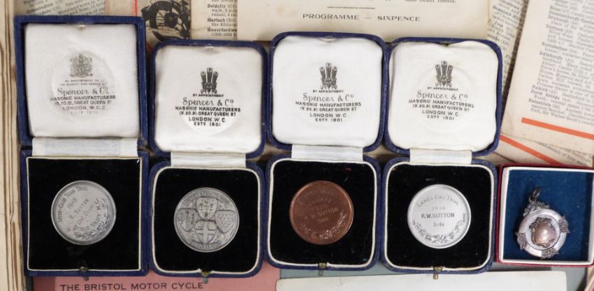 Stroud interest motorcycle trial ephemera and medals relating to R.W. Sutton, including silver medals for the 1936 Exeter, 1938 Land's End and 1948 Inter-Club Team trials, 1938 Exeter trial bronze medal and 1947 Stroud Valley Motor Club bronze medal. Route card for the 1937 Land's End trials, route card and results for the 1938 Land's End trial, similar card and results for the 1937 and 1939 Exeter trials and results booklets for the 1937 and 1938 Exeter Trials. 1940s and later Great Bear Stroud Valley Motor Club pages, Stroud Scramble 1947 programme. Scott is listed as riding Ariel 500cc and BSA 500cc motorbikes