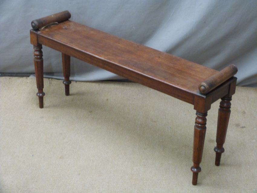 A 19thC (probably late Georgian) mahogany window seat with turned rests, raised on slim stepped tapering octagonal legs, W103 x D24 x H48cm