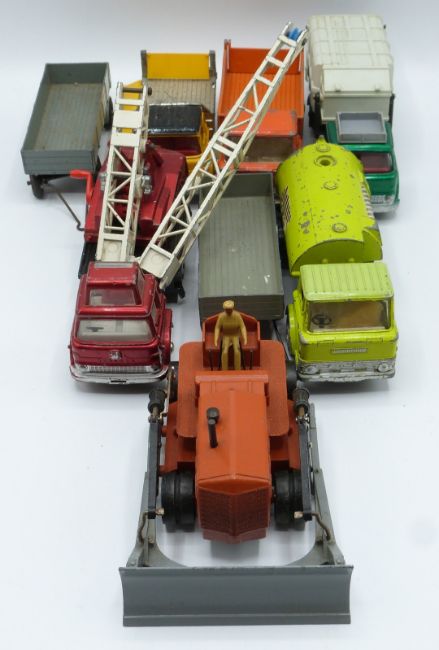 Fourteen Dinky Toys and Dinky Supertoys diecast model commercial and agricultural vehicles including Ford D800, Mercedes-Benz LP 1920, Coles Crane, Johnstone Road Sweeper.
