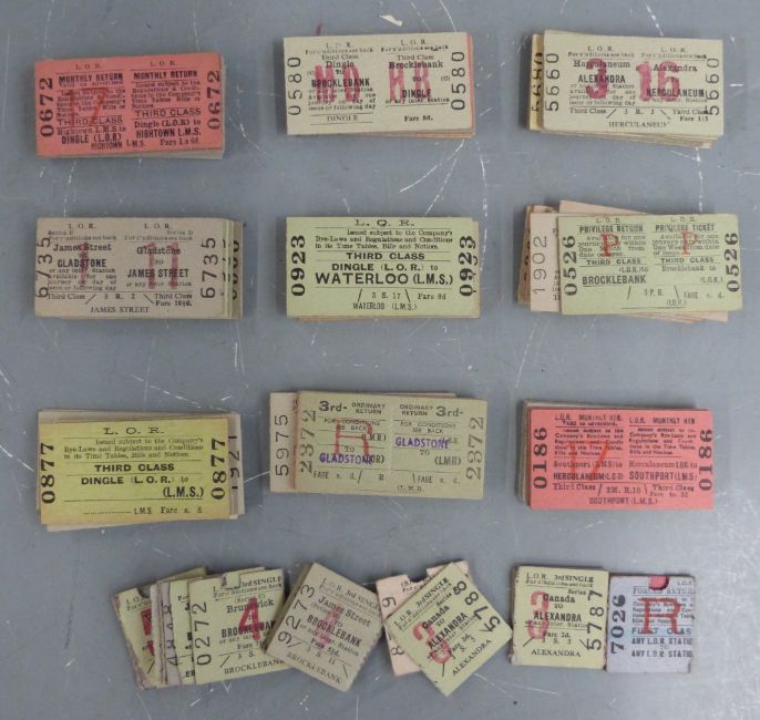 Approximately 10 Liverpool Overhead Railway tickets, including monthly and first class tickets