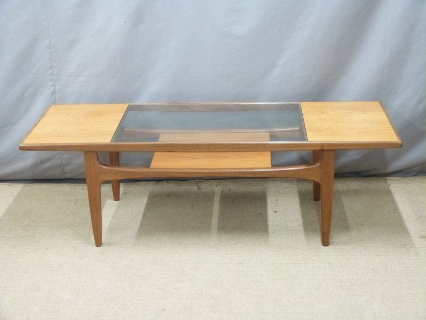 A retro / mid century modern glazed coffee table with undershelf, W136 x D51 x H43cm