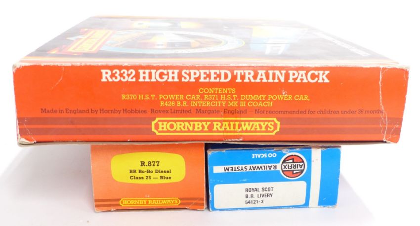 Three Hornby and Airfix 00 gauge model railway locomotives comprising High Speed Train Pack R.370, BR BO-BO Class 25 Diesel R.877 and BR 4-6-0 Royal Scot 54121-3, all in original boxes.