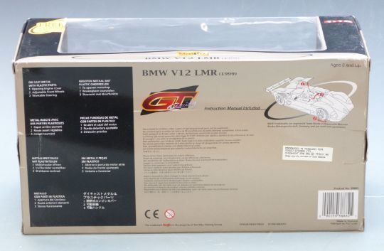 Three Maisto GT Racing 1:18 scale diecast model cars comprising BMW V12 LMR and Audi R8R Le Mans and R8 Le Mans-Sieger, all in original display boxes.