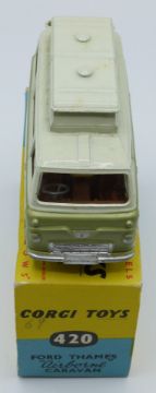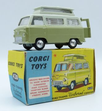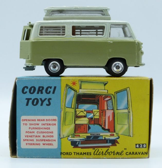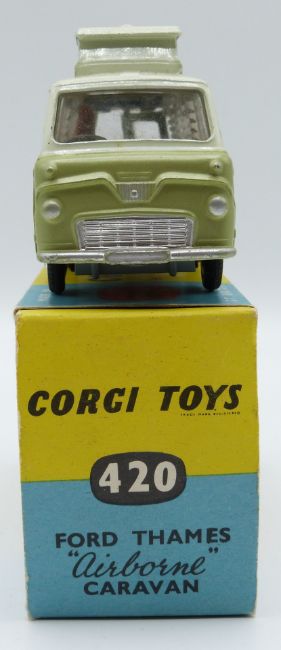 Corgi Toys diecast model Ford Thames Airborne Caravan with two-tone green and cream body, tan interior and silver hubs, 420, in original box.