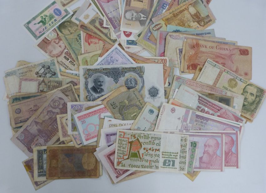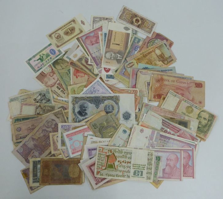 Over 140 overseas banknotes, includes some crisp uncirculated examples, Kyrgyz Republic, Ireland, Gibraltar etc