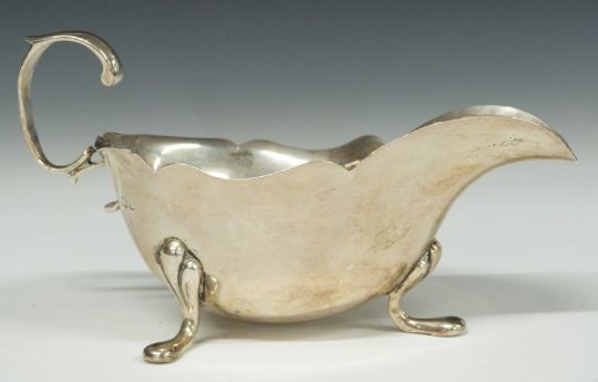Hallmarked silver sauce boat, raised on three feet, marks rubbed, length 14.5cm, weight 92g