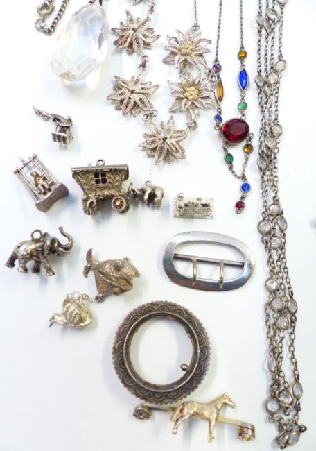 A collection of silver jewellery including chains, ingot, brooches, earrings, Victorian items, etc