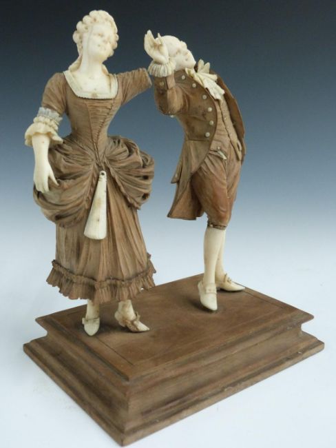 19thC continental finely carved wood and ivory figure of a lady and gentleman dancing, in the manner of Simon Troger, H19cm