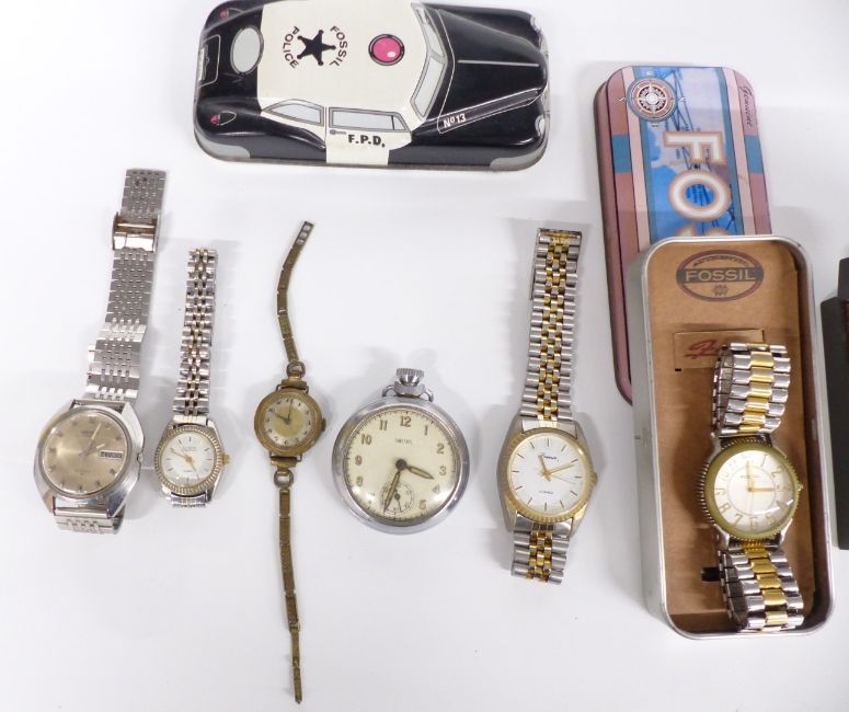 A collection of various wrist and pocket watches including Seiko automatic wristwatch ref. 7006-8100 with day and date aperture, Smiths, Fossil, Croton, Timex etc, some in original boxes/ tins.