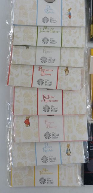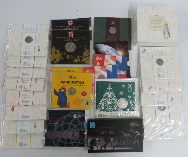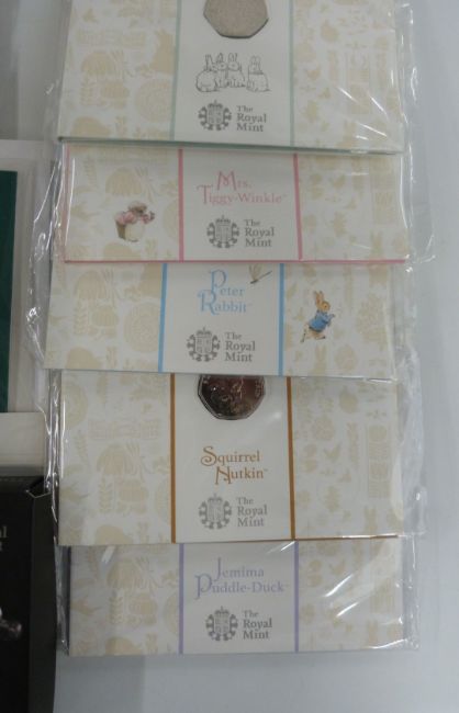 A collection of Beatrix Potter 50p coins in presentation packs, together with the Complete Countdown to London 2012 Olympics £5 coins, 2009-2012, Millennium crown etc