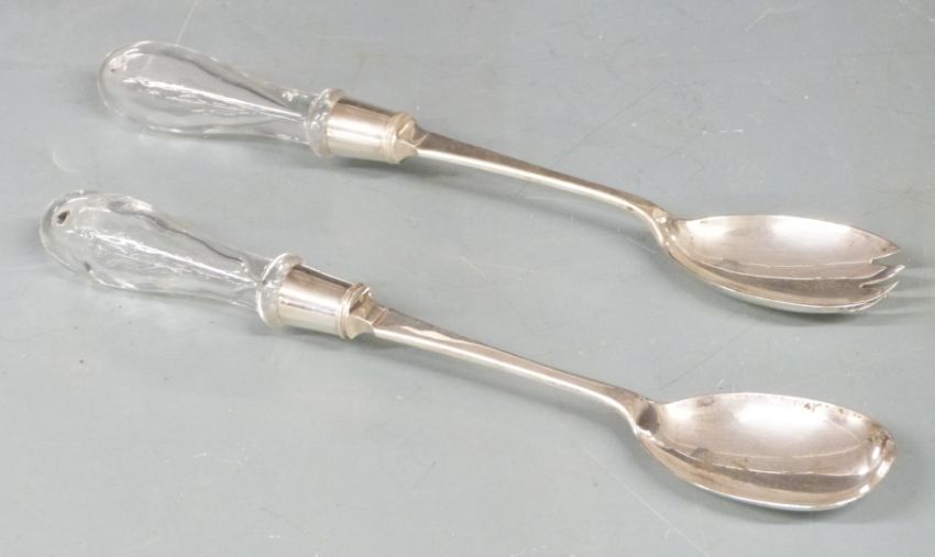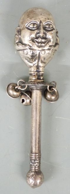 Pair of silver plated wine coasters, Mappin & Webb salad servers, 19thC Humpty Dumpty baby's rattle, oval tray, boxed cutlery storage rolls etc