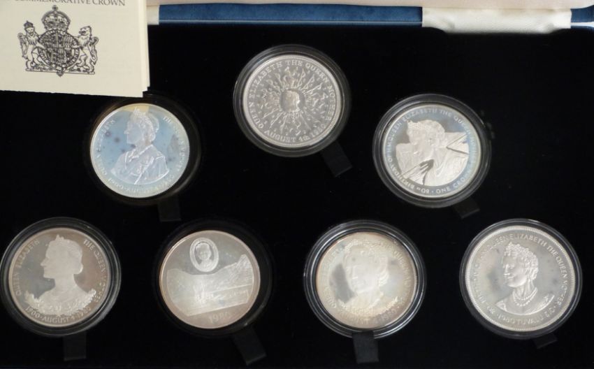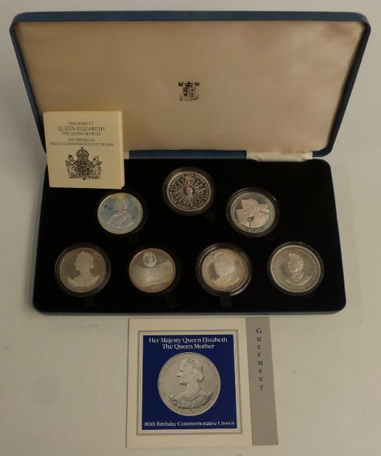 HM Queen Elizabeth Queen Mother Royal Mint 80th anniversary 1980 commemorative silver proof crown set of seven coins, cased with certificates