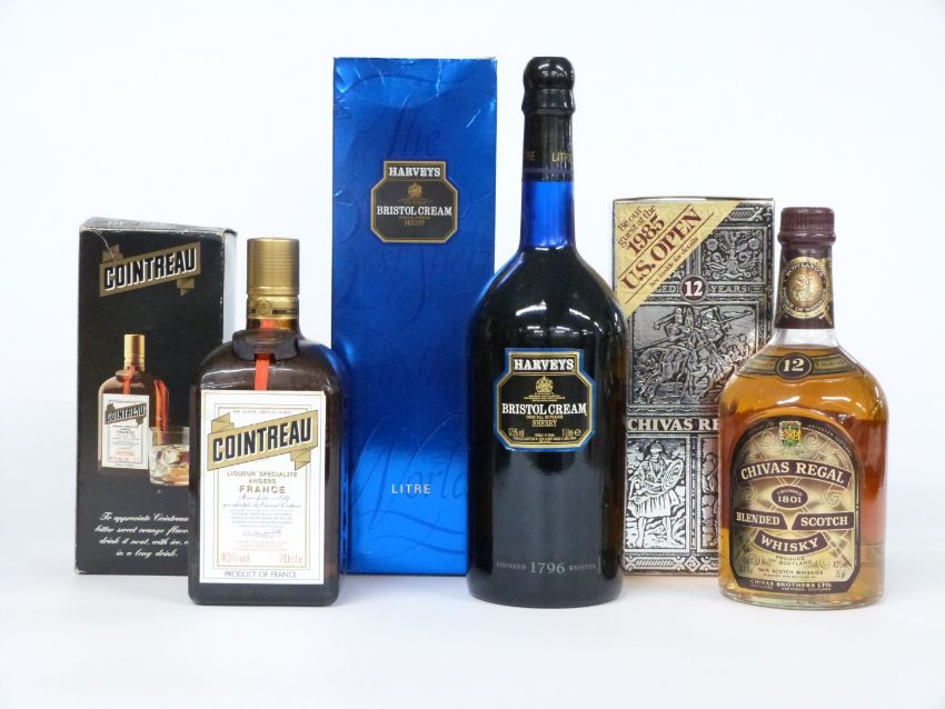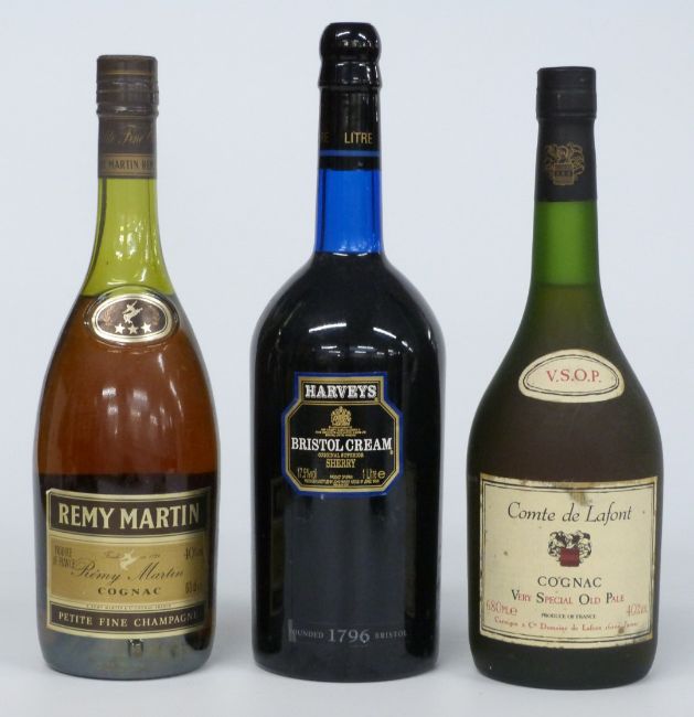 Collection of cognac, sherry and liqueurs including Comte de Lafont, 680ml 40%, Remy Martin 68cl 40%, boxed Chivas Royal 75cl 43% vol (75 proof), two Harvey's Bristol Cream, Curacao, Drambuie and Cointreau