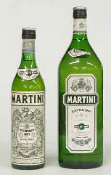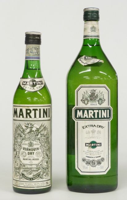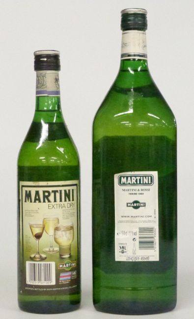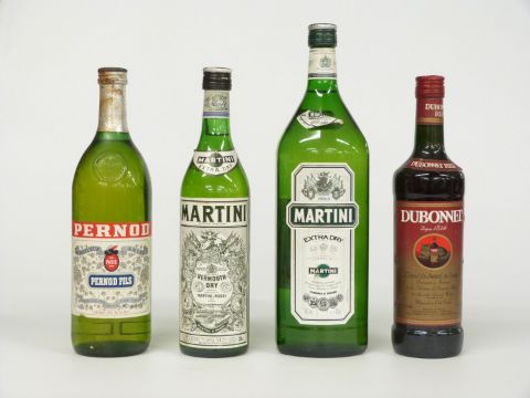 Two bottles of Martini Extra Dry Vermouth, one 75cl 14.7% vol the other 150cl 15% vol together with a bottle of Pernod 43% vol and a bottle of Dubonnet 75cl 14.7% vol