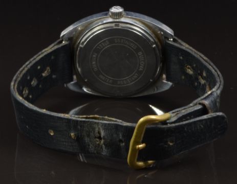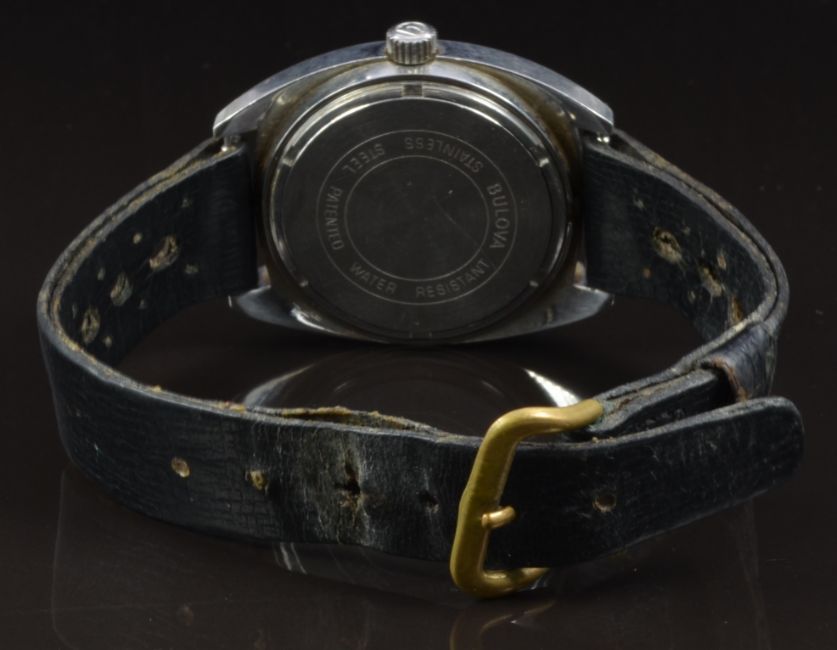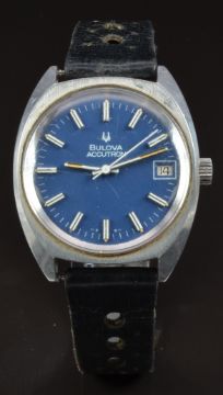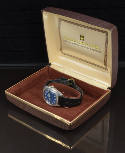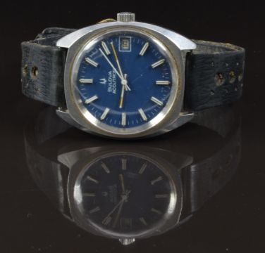 Bulova Accutron gentleman's wristwatch ref.7303-2 with date aperture, luminous hands, white and silver baton markers, blue dial, stainless steel case and signed calibre 2181F movement, on black leather strap, case diameter 35mm, serial number 3-719590, in original box with guarantee, instructions and service booklet.
