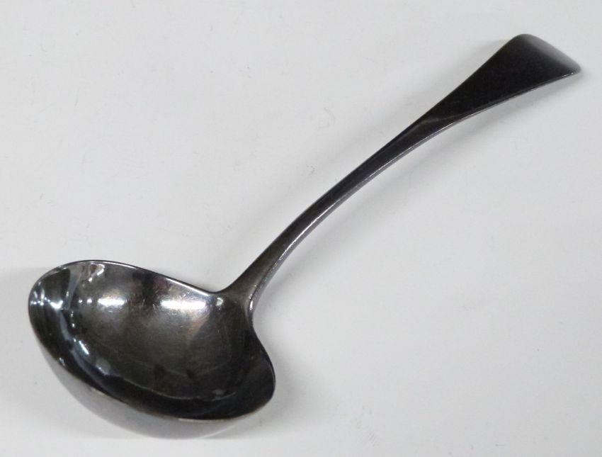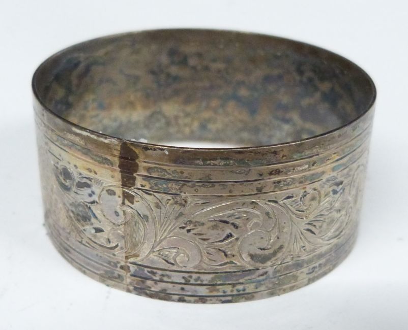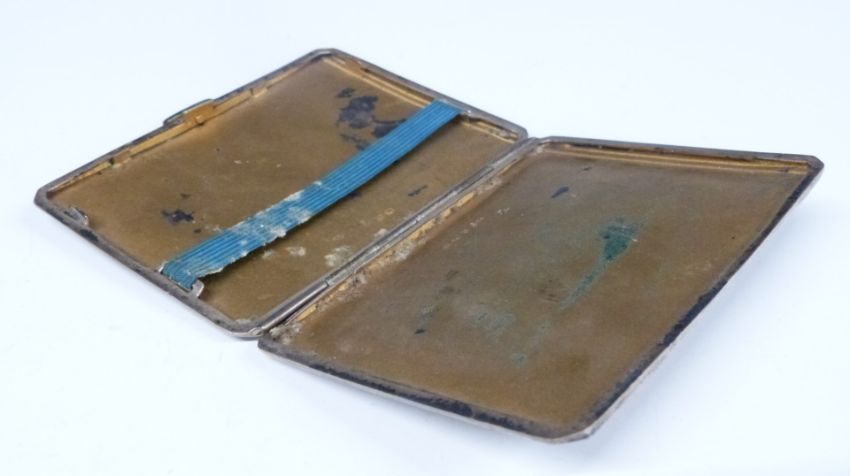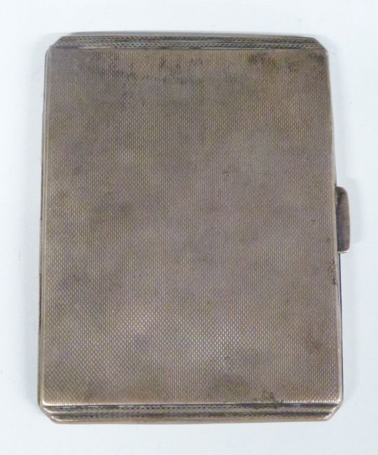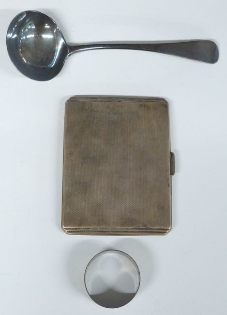 Art Deco hallmarked silver cigarette case with engine turned decoration, Georgian hallmarked silver ladle, length 18cm and a hallmarked silver napkin ring, weight 242g