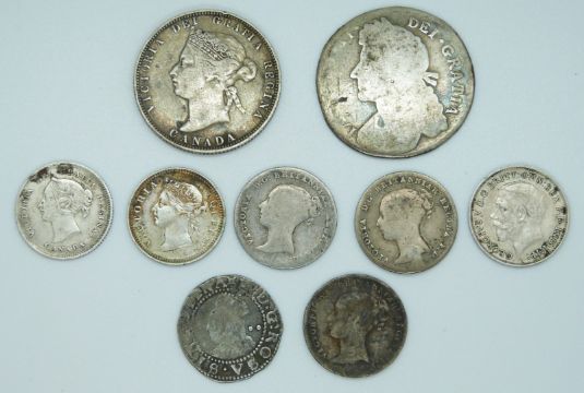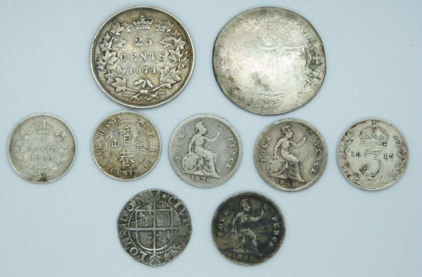 An interesting group of silver coins to include Elizabeth I half groat, Victorian 1901 Hong Kong 5 cents, Canada 1880 5 cents, 25 cents 1874, James II shilling etc