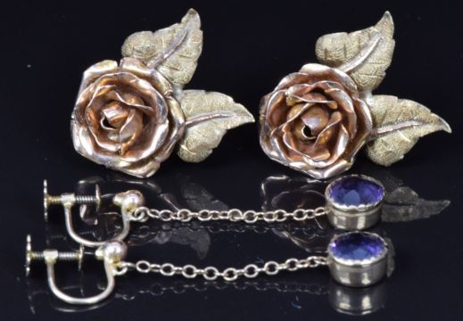 A pair of 9ct gold earrings set with an amethyst to each (1.1g) and a pair of 14ct gold earrings in the form of a rose, 4.2g