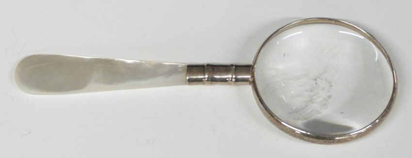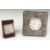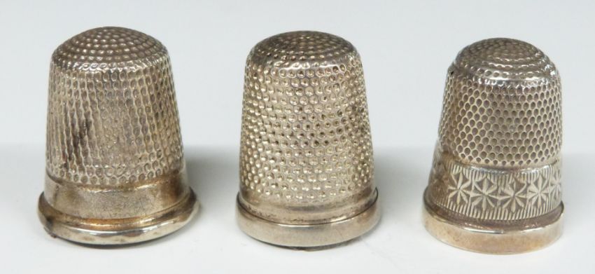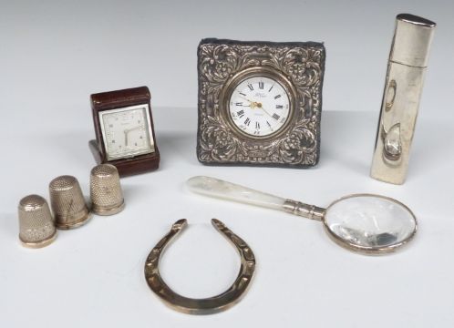 Doxa Art Deco leather cased travelling clock, length when closed 43mm, hallmarked silver mounted clock, hallmarked silver novelty horseshoe, three silver thimbles, mother of pearl handled magnifier and a toothpick holder