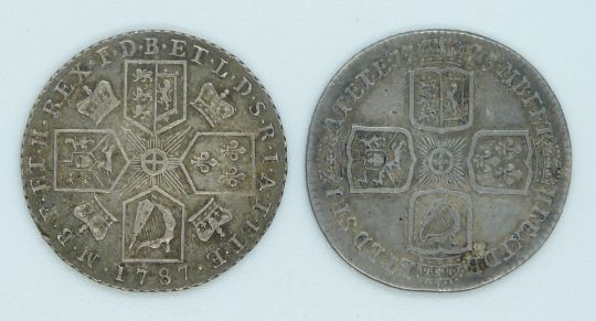 George II 1745 shilling LIMA below bust plain angles reverse, together with a George III 1878 example, no semee of hearts reverse
