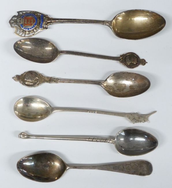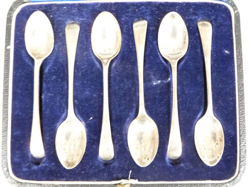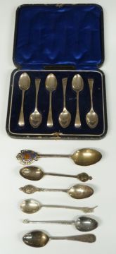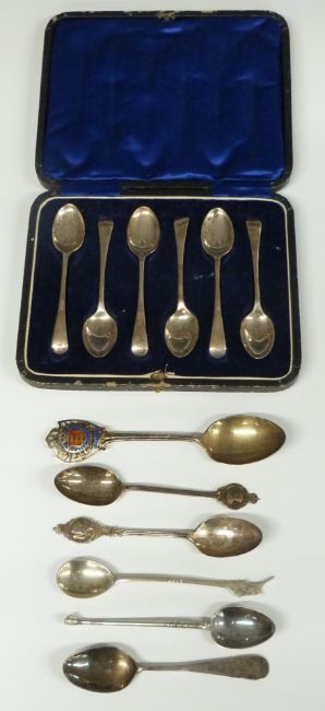Cased set of six hallmarked silver teaspoons and further loose hallmarked and white metal spoons, weight 142g