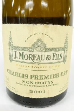 Three bottles of J Moreau et Fils Chablis Premier Cru, Montmains 2001 Burgundy white wine 75cl 12.5% vol