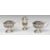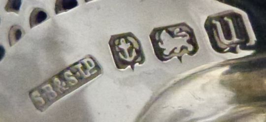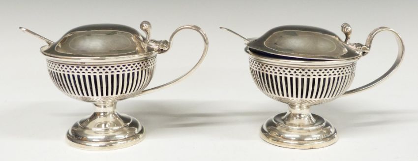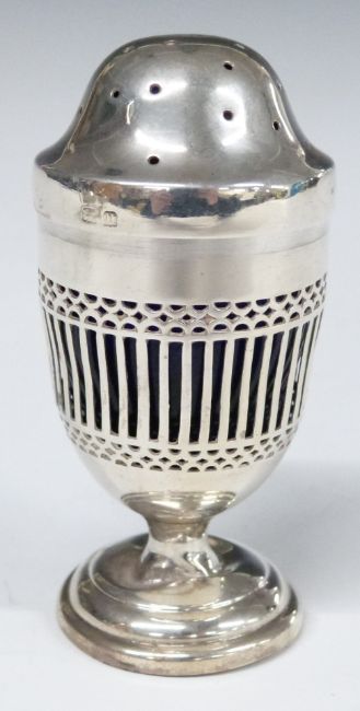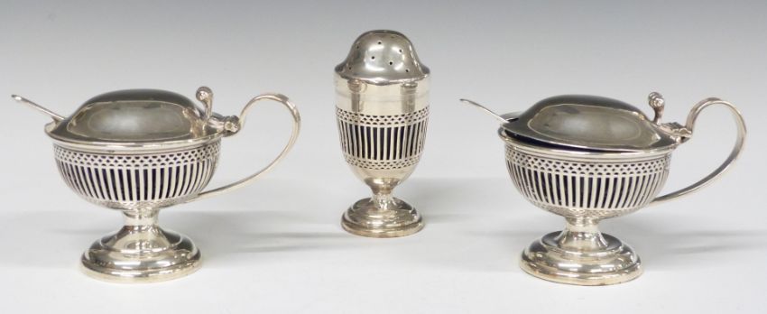 George V hallmarked silver three piece cruet set with blue glass liners and pierced bodies together with one silver and one plated spoon, Birmingham 1919, maker S Blanckensee & Son Ltd, height of pepper 8.5cm, weight without liners and plated spoon 243g