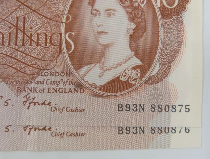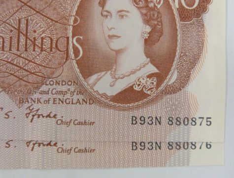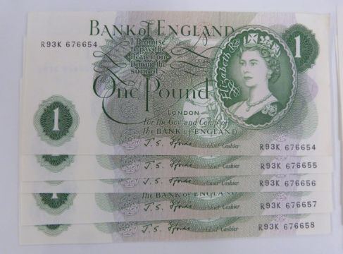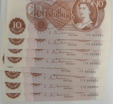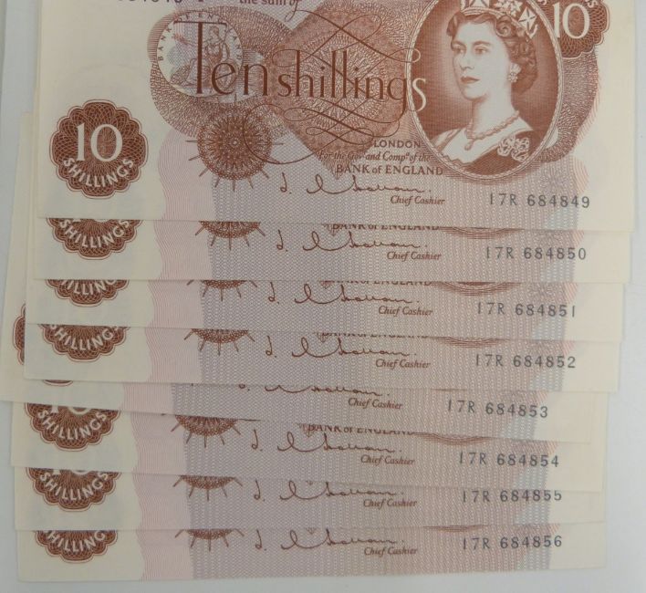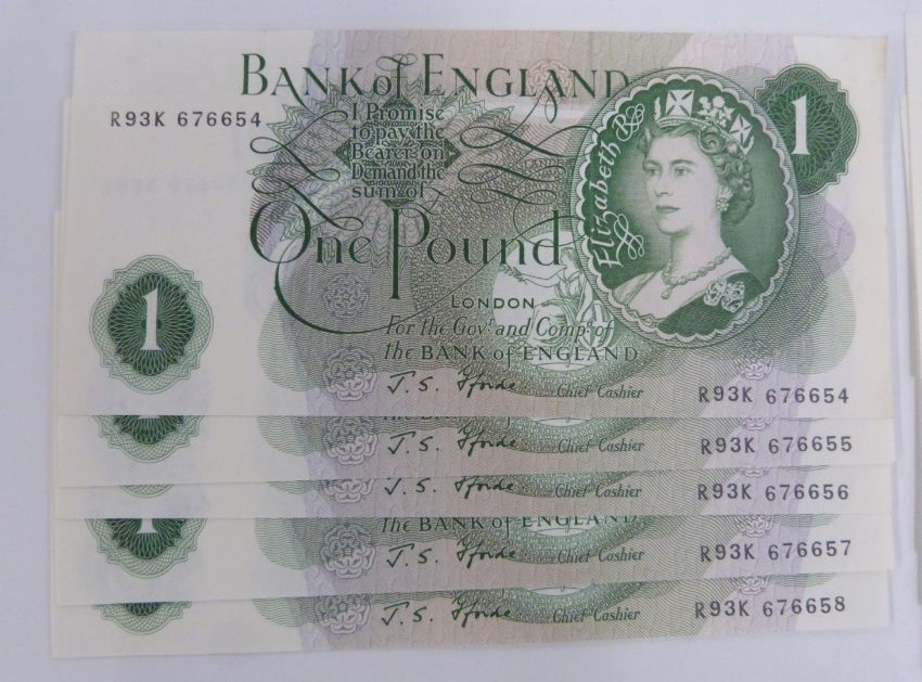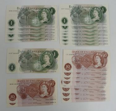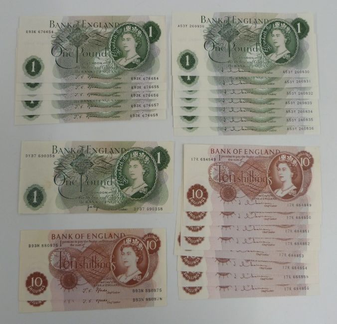 Twenty three British banknotes 1962-1970 to include sever Hollom consecutive uncirculated £1 notes, eight Hollom consecutive uncirculated ten shilling notes, a pair of consecutive Fforde ten shilling notes, five Fforde consecutive uncirculated £1 notes and a Page example