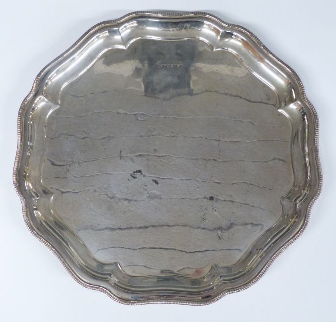 Walker & Hall modern hallmarked silver salver with shaped edge and raised on three feet, Birmingham 1961, diameter 36cm, weight 1030g
