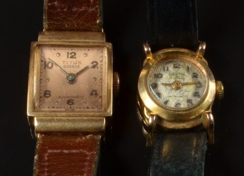 Two 18ct gold ladies wristwatches, one Titus with black hands, gold Arabic numerals and bronze dial, the other Onsetta with gold hands and Arabic numerals and silver dial, both on leather straps.