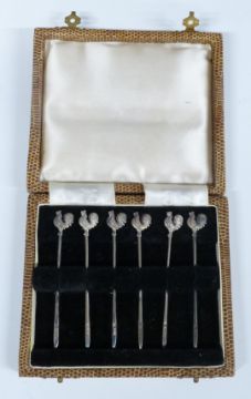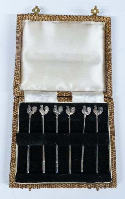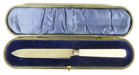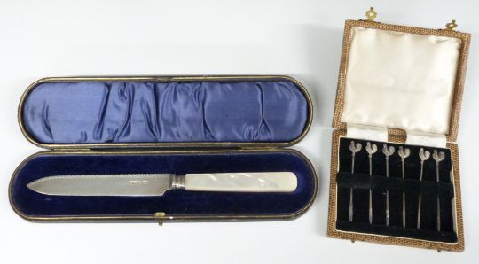 Cased set of hallmarked silver cocktail sticks and a cased hallmarked silver bladed mother of pearl handled knife, Sheffield 1910, length 23cm