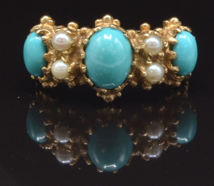 A 9ct gold ring set with seed pearls and faux turquoise, size M, 4.1g