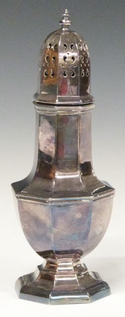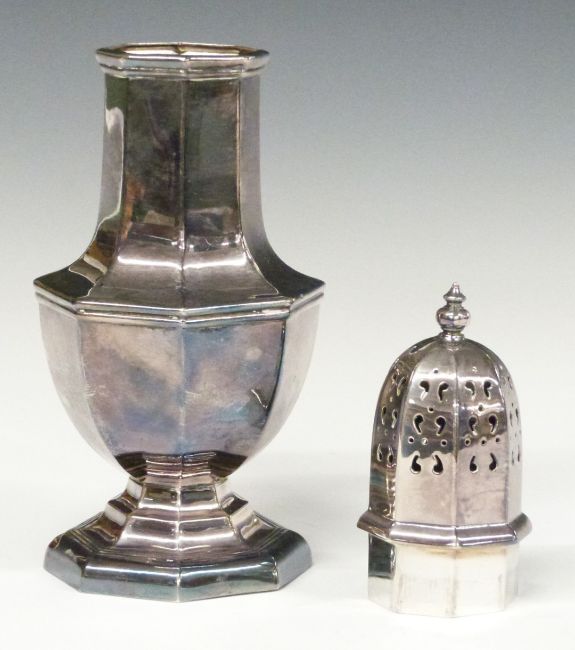 Modern octagonal hallmarked silver sugar caster of baluster form, height 21cm, weight 242g