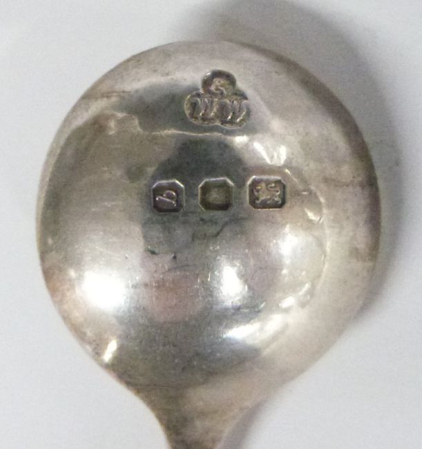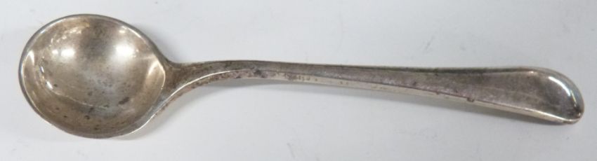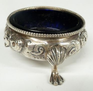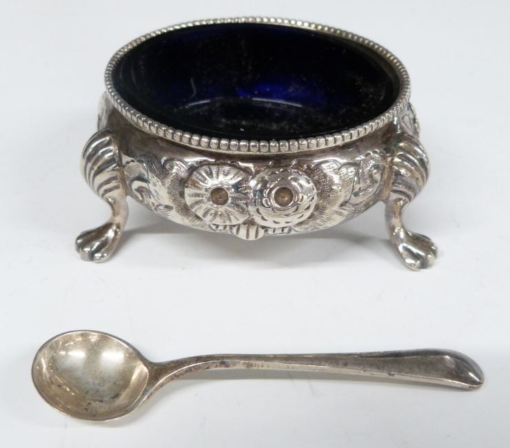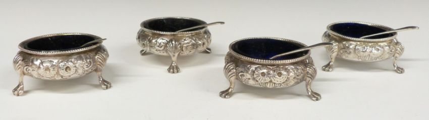 Victorian set of four hallmarked silver open salts with blue glass liners, London two 1863 and two 1866, all maker Robert Harper, diameter 7.5cm, together with four hallmarked silver spoons, weight 256g