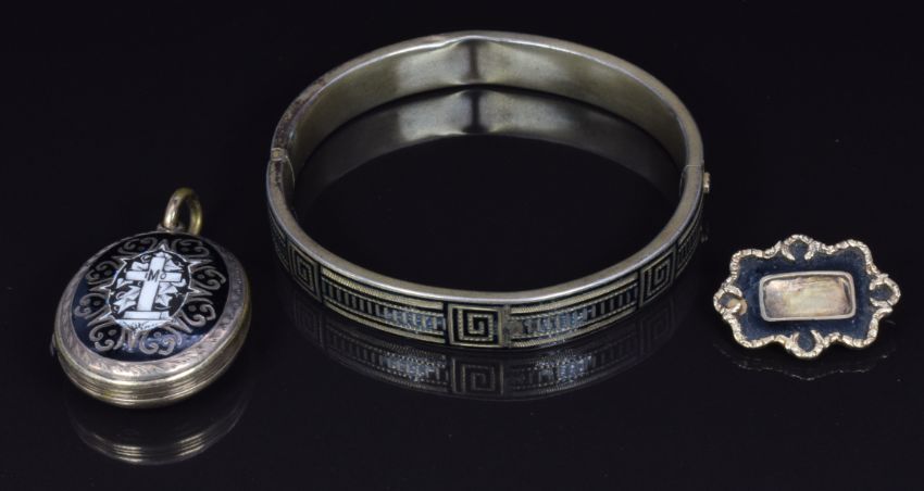 Victorian bangle set with black enamel and a Victorian mourning locket set with black and white enamel