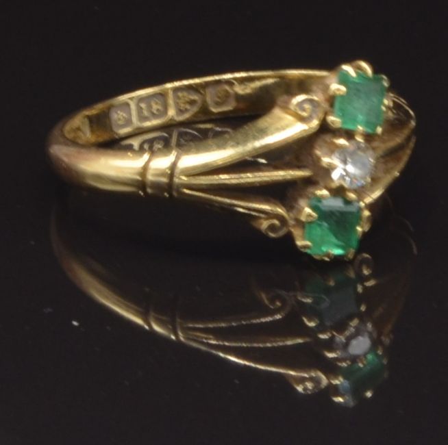 An 18ct gold ring set with a round cut diamond and two square cut emeralds, Chester 1915, size M, 2.9g