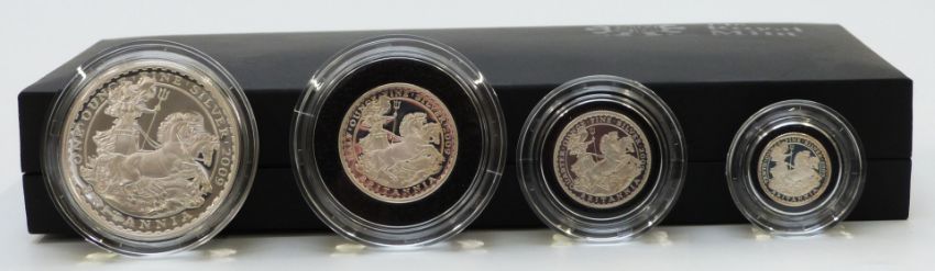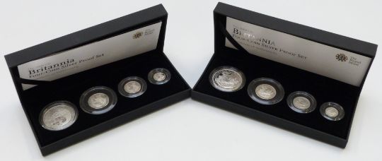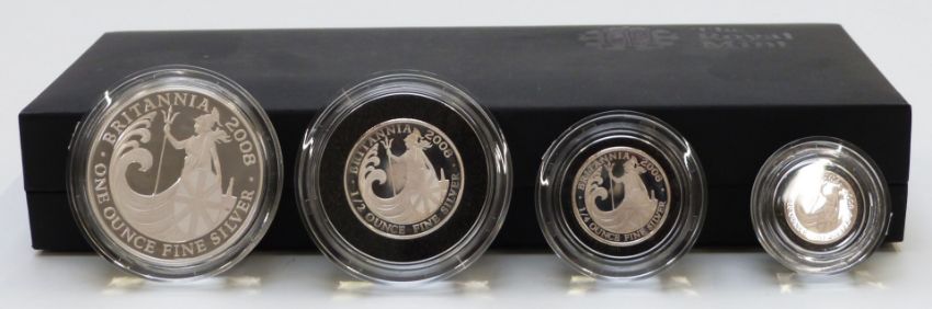 Royal Mint cased four coin silver proof Britannia 2008 and 2009, with certificates