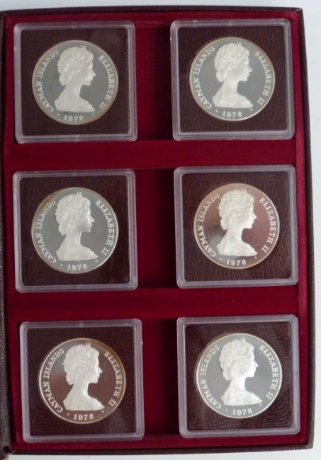 Queen Elizabeth II 25th anniversary of the Coronation Cayman Islands Regalia Silver Collection 1953-1978 comprising six silver crown sized coins in fitted case