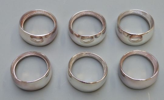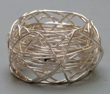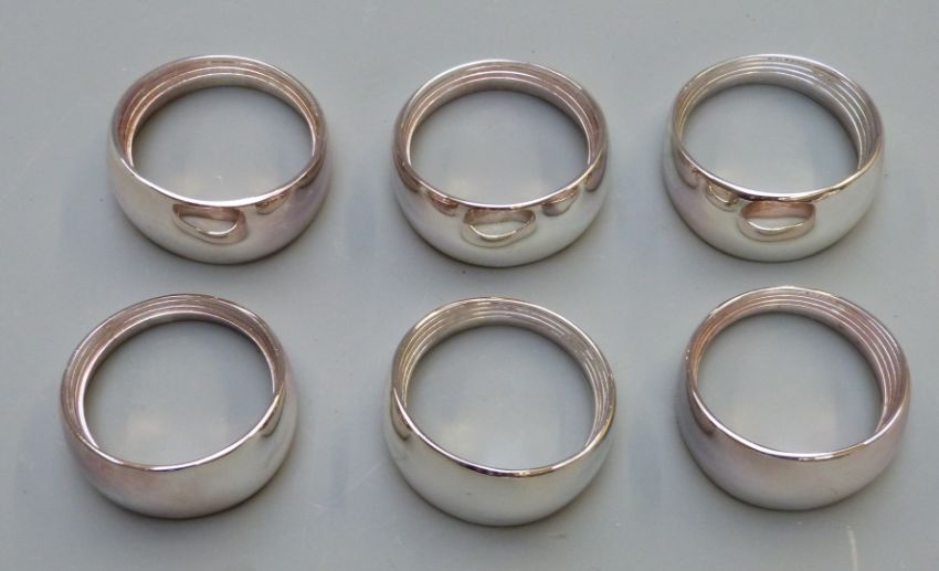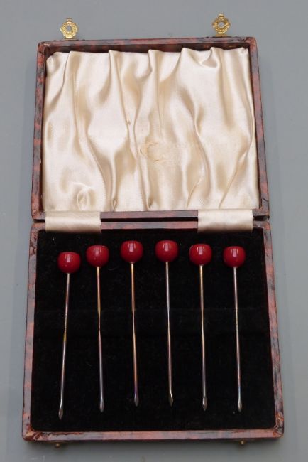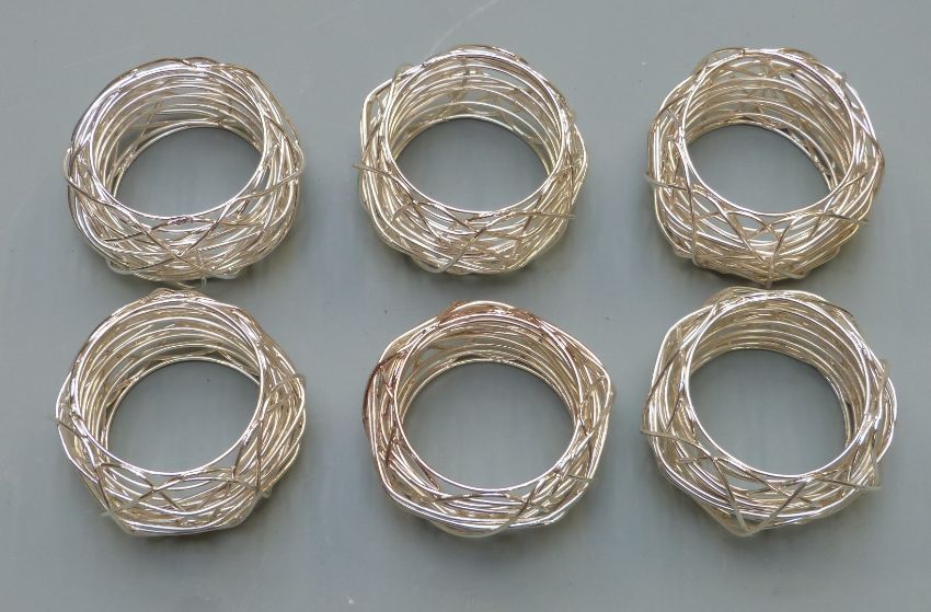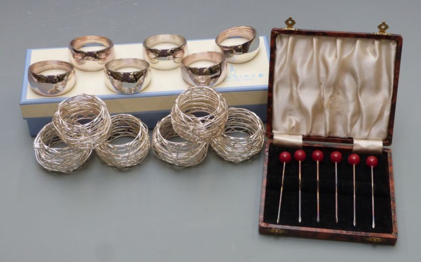 Newbridge silverware boxed set of six napkin rings, further set of six wirework napkin rings and a cased set of six sterling silver cherry cocktail sticks