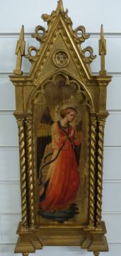 Pair of 19thC carved and gilt icons painted with winged angels, H64cm