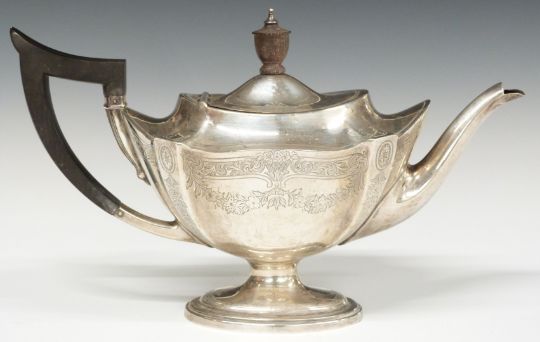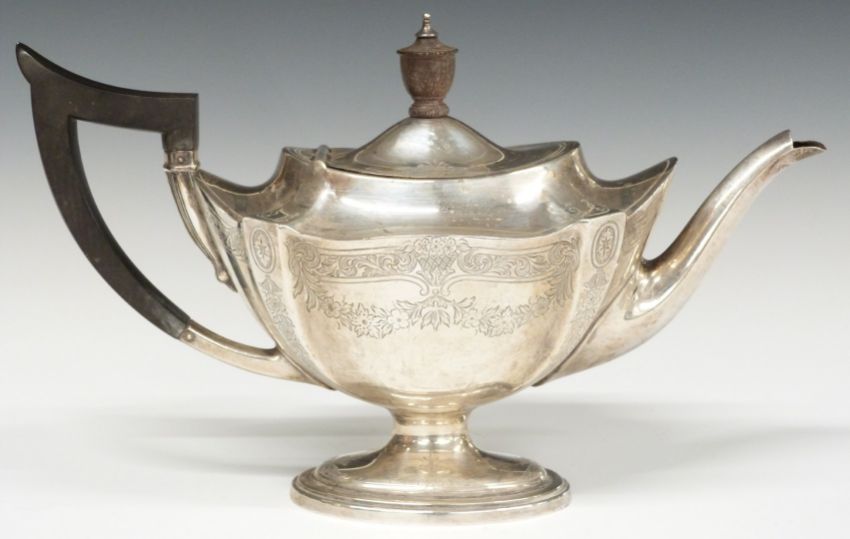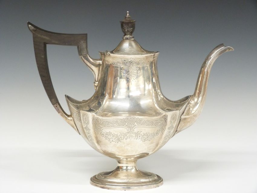 Gorham American white metal teapot and coffee pot with engraved floral swag decoration, marked to underside with Gorham maker's marks and Sterling, height of tallest 20cm, weight 1005g all in