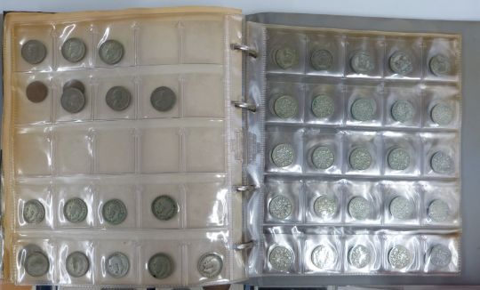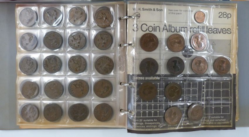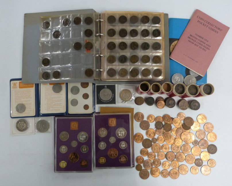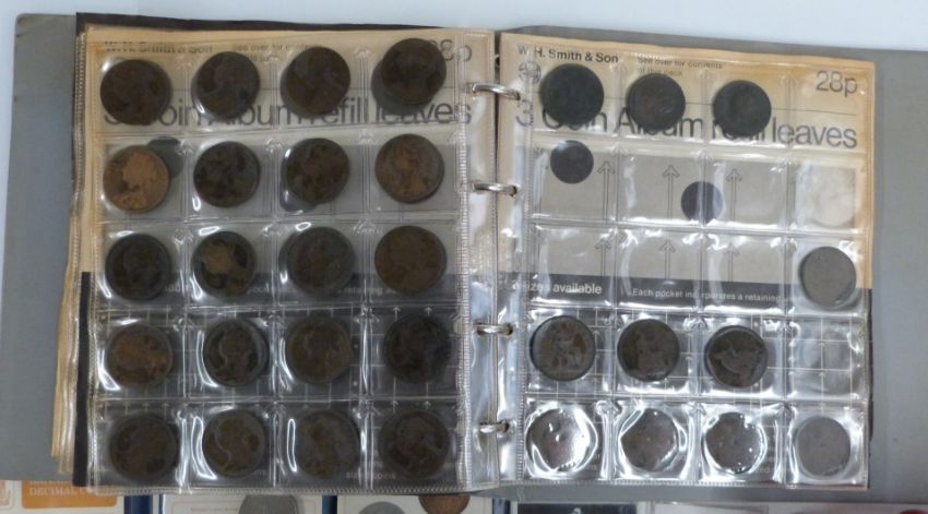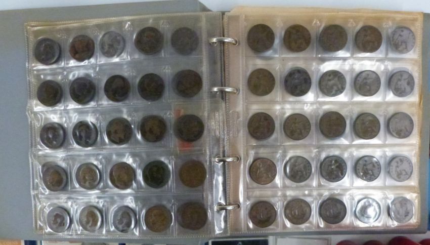 An amateur collection of largely UK coinage, Queen Victoria onwards, in album, together with a quantity of sundry coinage including modern crowns and four £5 examples, coin sets etc, small silver, Heaton mint, pennies etc