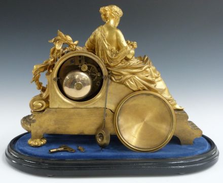 Vincenti & Cie 19thC French figural brass ormolu mantel clock, the female seated figure dressed in classical Roman / Greek robes holding a nest of chicks, the enamelled face and plaque decorated with Pliny's doves and putti in Limoges style, the movement impressed with Medaille D'Argent, Vincenti & Cie and Ambrosini Pans 592. With base and glass dome, W34 x D10 x H33cm, the dome and base W40 x D19 x H33cm