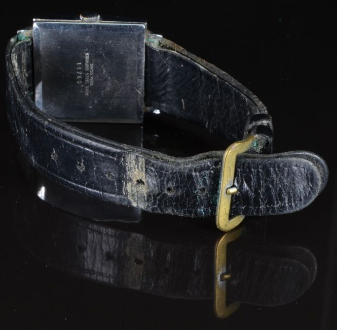Bernex gentleman's wristwatch with inset subsidiary seconds dial, silver hands, baton hour markers and dial and square stainless steel case, on black leather strap, case diameter 28mm, serial number 11760.