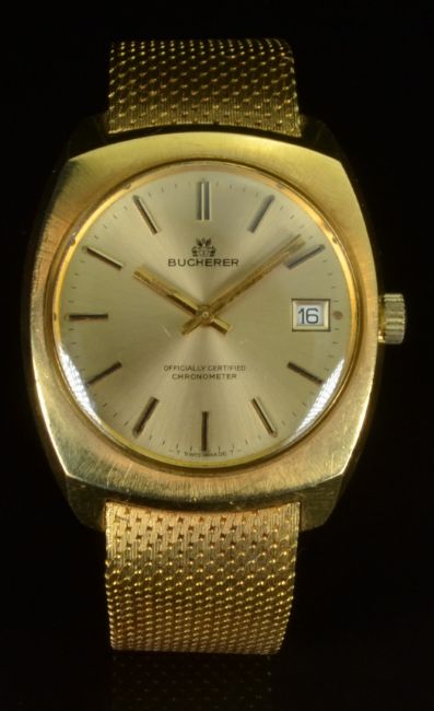 Bucherer 18ct gold gentleman's automatic wristwatch with date aperture gold hands, two-tone baton hour markers, champagne dial and signed ETA 21 jewel calibre 2824 movement, on 18ct gold bracelet, case diameter 36mm, serial number 149268, 97.5g.